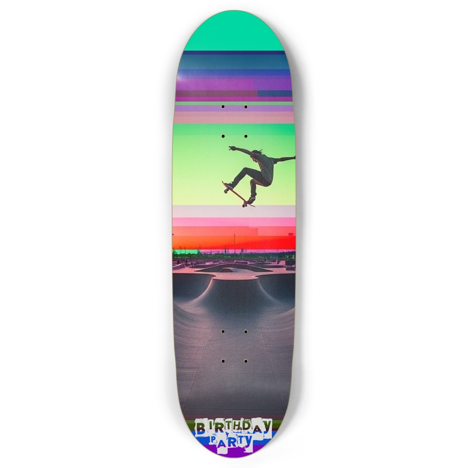 This skateboard deck features a dynamic design where vibrant horizontal glitch bands—teal, violet, pink, red, and lime—slice through a silhouetted image of a skateboarder mid-air over a concrete full pipe at sunset.