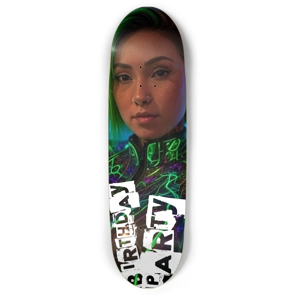 Aaliyah skateboard, green hair skateboard, neon skateboard, custom skateboard, graphic skateboard, unique skate deck, Birthday Party skate, streetwear, skate art, collectible skateboard.