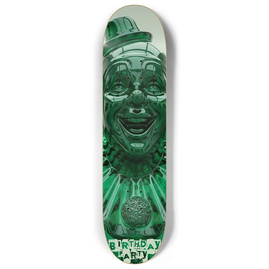 The skateboard deck displays a glossy, translucent emerald green clown face design that appears sculpted or glass-like and glows in the dark, featuring a smiling mouth, hat, ruffled collar, and "BIRTHDAY PARTY" at the bottom. This unique and artistic 7-Ply 100% Canadian Maple Skateboard Deck creates a distinct and luminescent visual impression.