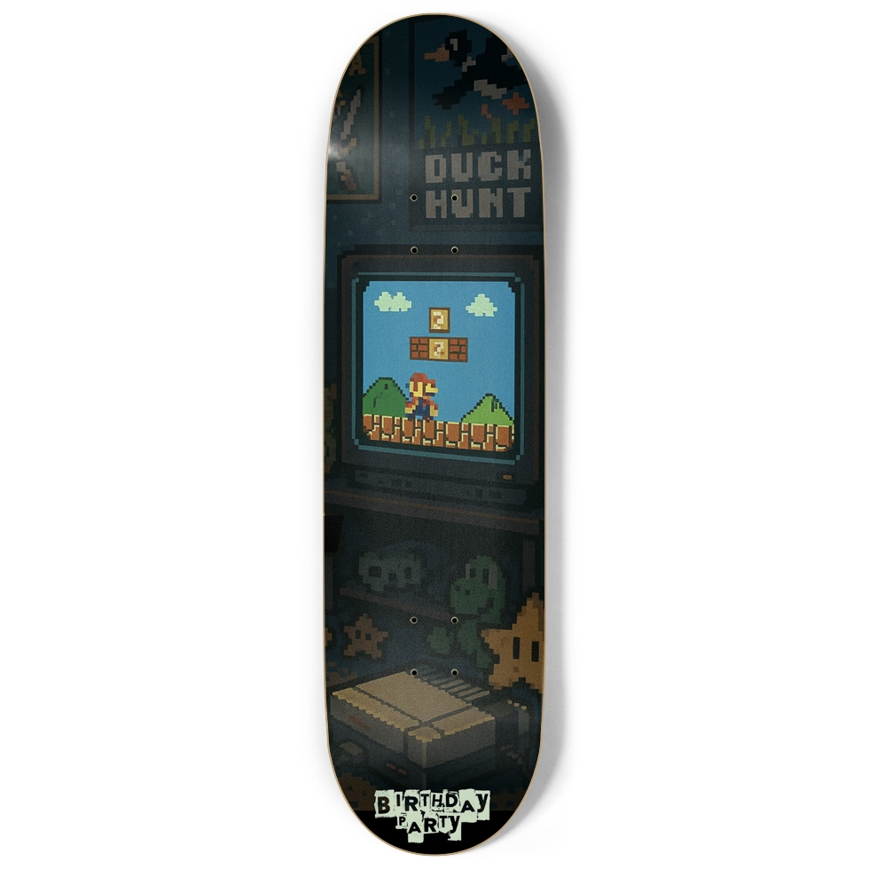 This skateboard features a nostalgic pixel-art design that pays homage to classic 8-bit video games. The top half of the deck showcases a pixelated "DUCK HUNT" title with a duck sprite, hinting at a gaming room setting. The main focus is a vintage television displaying a scene from the original Super Mario Bros. game, with Mario jumping amidst classic blocks and Goombas.