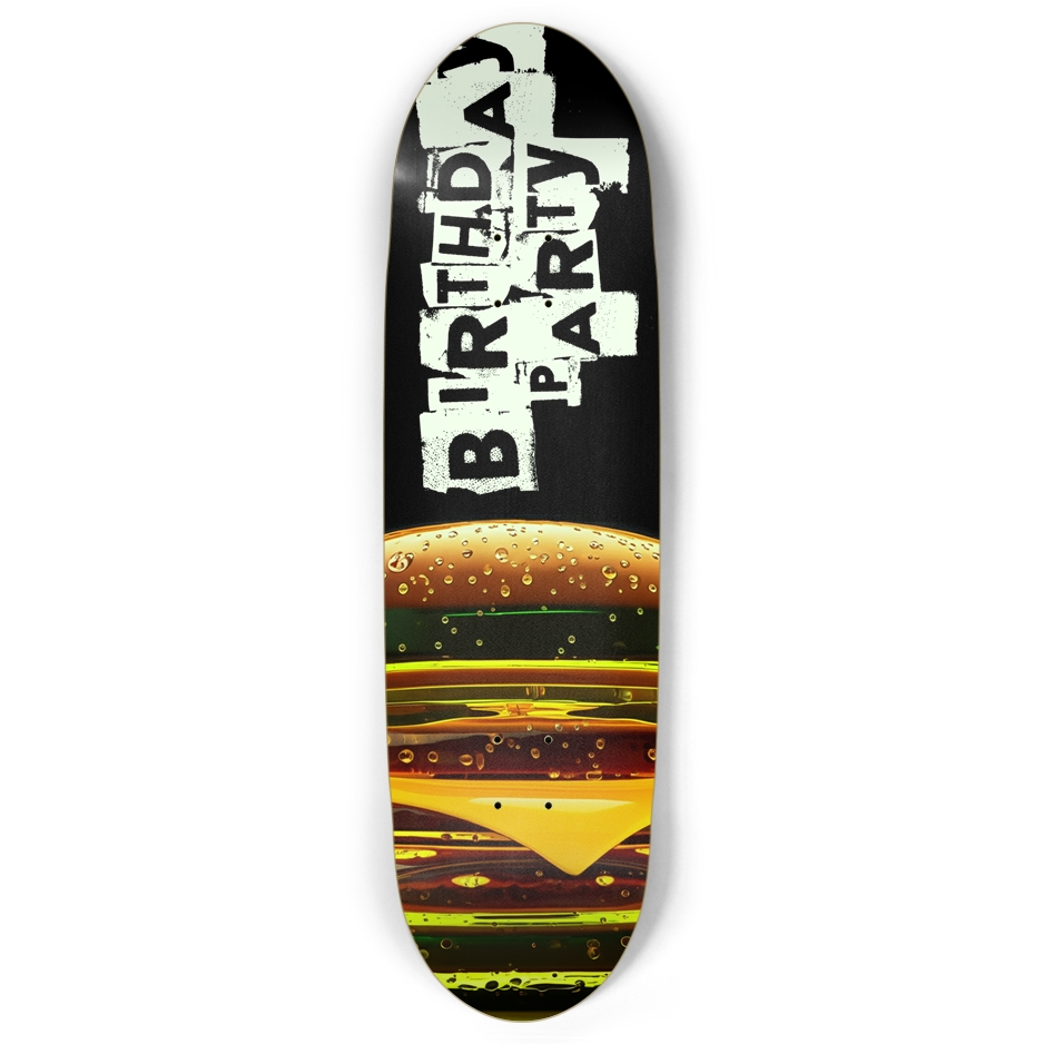 This skateboard deck showcases a bold and eye-catching design. The upper two-thirds of the deck feature a solid black background, against which distressed white text boldly announces "BIRTHDAY PARTY." The lettering has a stencil-like or spray-painted appearance, with an uneven, gritty texture, and some letters are rotated or reversed, giving it a raw, urban, and slightly chaotic aesthetic.